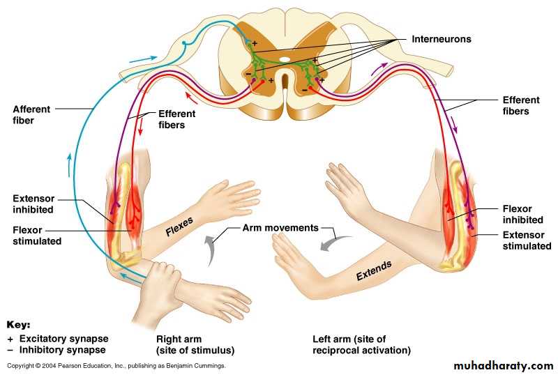 Branches of the afferent neurons cause widespread inhibition via interneurons, of the motor neurons to the contracting muscle and its synergists.