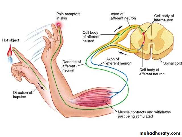 WITHDRAWAL REFLEX (fig.13-6)Cutaneous sensory stimuli on a limb are likely to cause the flexor muscles of the limb to contract, thereby stimulating withdrawing the limb from the stimulating object. This is called "flexor reflex" or the "nociceptive reflex" or simply "pain reflex".