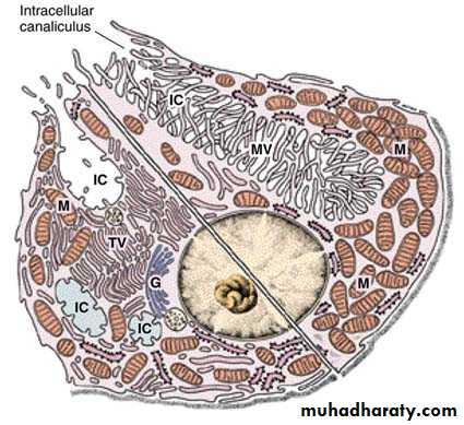 c) Parietal (oxyntic) cells:- are present mainly in the upper half of the gland. They are large rounded or pyramidal cells with one centrally placed spherical nucleus & intensely eosinophilic cytoplasm. The most striking features of the active secreting cell seen in the electron microscope are an abundance of mitochondria (eosinophilic) & a deep circular invagination of the apical plasma membrane, forming the intracellular secretory canaliculus lined with abundant microvilli. In the resting cell, a number of tubulovesicular structures can be seen in the apical region of the cell. At this stage, the cell has few microvilli. When stimulated to produce HCl, tubulovesicles fuse with the cell membrane to form the canaliculus & more microvilli, suggesting that tubulovesicles are involved in secretion. The parietal cells secrete the HCl & gastric intrinsic factor (a glycoprotein that binds to vitamin B12 & facilitate its absorption by the intestine). Lack of the intrinsic factor can lead to vitamin B12 deficiency →pernicious anaemia. In cases of atrophic gastritis, both parietal and peptic cells are much less numerous, and the gastric juice has little or no acid or pepsin activity, and no intrinsic factor → pernicious anaemia.