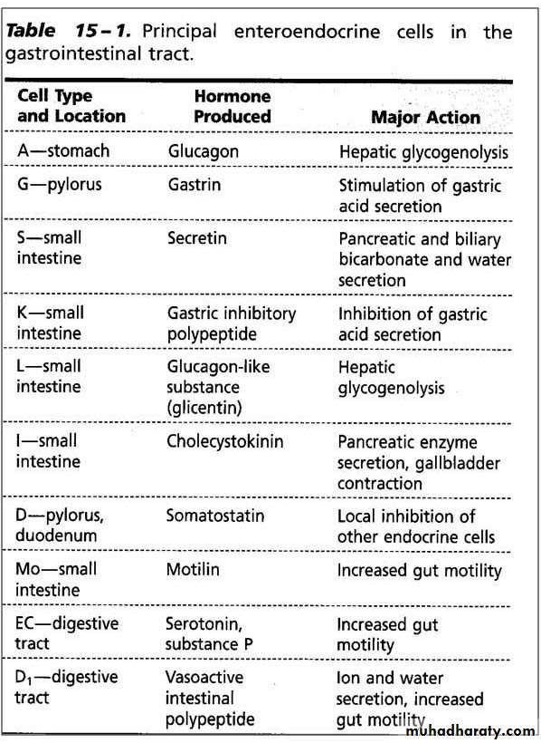 c) Enteroendocrine cells:- they are small, pyramidal cells & have granules beneath the nucleus. Upon stimulation these cells release their secretory granules by exocytosis, and the hormones may exert paracrine (local) or endocrine (blood-borne) effects. They produce hormones such as secretin, cholecystokinin, gastric inhibitory polypeptide & motilin.