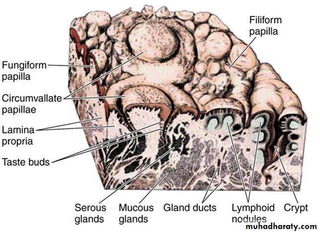 1-Filiform papillae: they have an elongated, conical shape. They are the most numerous and distributed over the dorsum of the anterior two thirds of the tongue. Each papilla has a thin core of c.t. lamina propria and is covered by a pointed cap of stratified squamous epithelium which is cornified (keratinized). These papillae do not contain taste buds.2-Fungiform papillae: are fewer and larger than the filiform and are scattered irregularly among them. They have narrow stalk (base) and a dilated upper part with smooth surface in the shape of mushroom. They frequently contain taste buds on their upper surfaces, and they are very vascular.