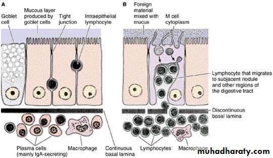 M-cell (microfold cells, membranous epithelial cells):- are specialized epithelial cells overlying the lymphoid follicles of Peyer's patches. They are relatively flat cells whose apical surface is thrown into small folds rather than microvilli. These cells are characterized by the presence of numerous basal membrane invaginations that form pits containing many intraepithelial lymphocytes & antigen- presenting cells (macrophage). M cells can endocytose antigens & transport them to the underlying macrophages & lymphoid cells, which then migrate to the lymph nodes, where immune response to foreign antigens are initiated. M cells represent an important link in the intestinal immunologic system. The basement membrane under M cells is discontinuous, facilitating transit between the lamina propria & M cells.