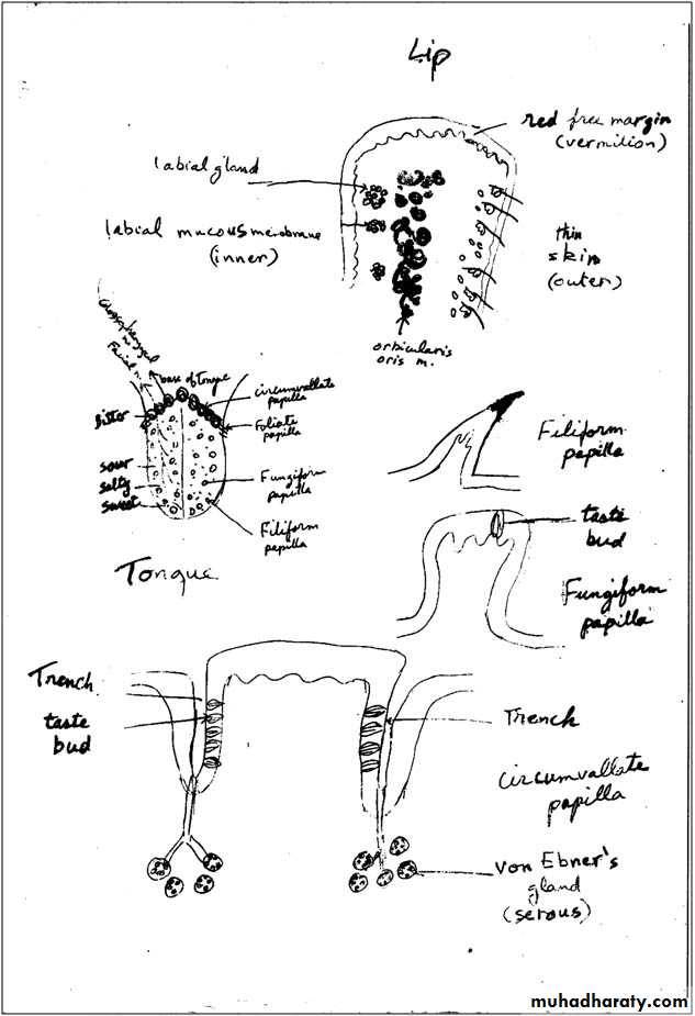 The inner surface of the lip is lined by mucous membrane. The epithelium of this surface is thicker than the epidermis covering the outer surface of the lip and is of the stratified squamous non-keratinized type. High papillae of the c.t. lamina propria extend into it. Small clusters of labial glands are embedded in the lamina propria and connected with the surface by means of little ducts.