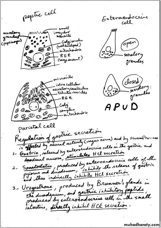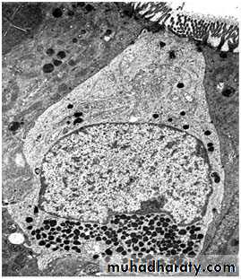 d) Enteroendocrine cells:- were formerly called argentaffin & enterochromaffin cells, owing to their affinity for silver & chromium stains. Most of the cells have the characteristics of the so-called APUD cells (amine precursor uptake & decarboxylation), which are wide spread in the body (found in the epithelium of GIT, respiratory tract, in the pancreas & thyroid gland). Their cytoplasm either contains polypeptide hormones or the biogenic amines epinephrine, norepinephrine, or 5-hydroxytryptamine (serotonin). These cells have characteristics of diffuse neuroendocrine system (DNES).These cells can be identified & localized by immunocytochemical methods or other cytochemical techniques for specific amines. The enteroendocrine cells are small pyramidal cells found near the bases of gastric glands. They are characterized by the presence of abundant dense secretory granules, always located at the base of the cell between the nucleus & basal lamina. This suggests that they are endocrine cells that liberate their secretion into the blood vessels in the lamina propria rather than into lumen of the gland. Some of these cells are known as paracrine because they produce hormones that diffuse into the surrounding extracellular fluid to regulate the function of neighboring cells without passing through the vascular system.