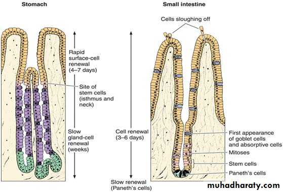e) Stem cells (undifferentiated cells):- are found in the neck region of all gastric glands (cardiac, fundic & pyloric). These cells have a high rate of mitosis; some of them move upward to replace the pit & surface mucous cells, which have a turnover time of 4-7 days. Other daughter cells migrate more deeply into the glands & differentiate into the different types of cells of the glands. These cells are replaced much more slowly than are surface mucous cells.