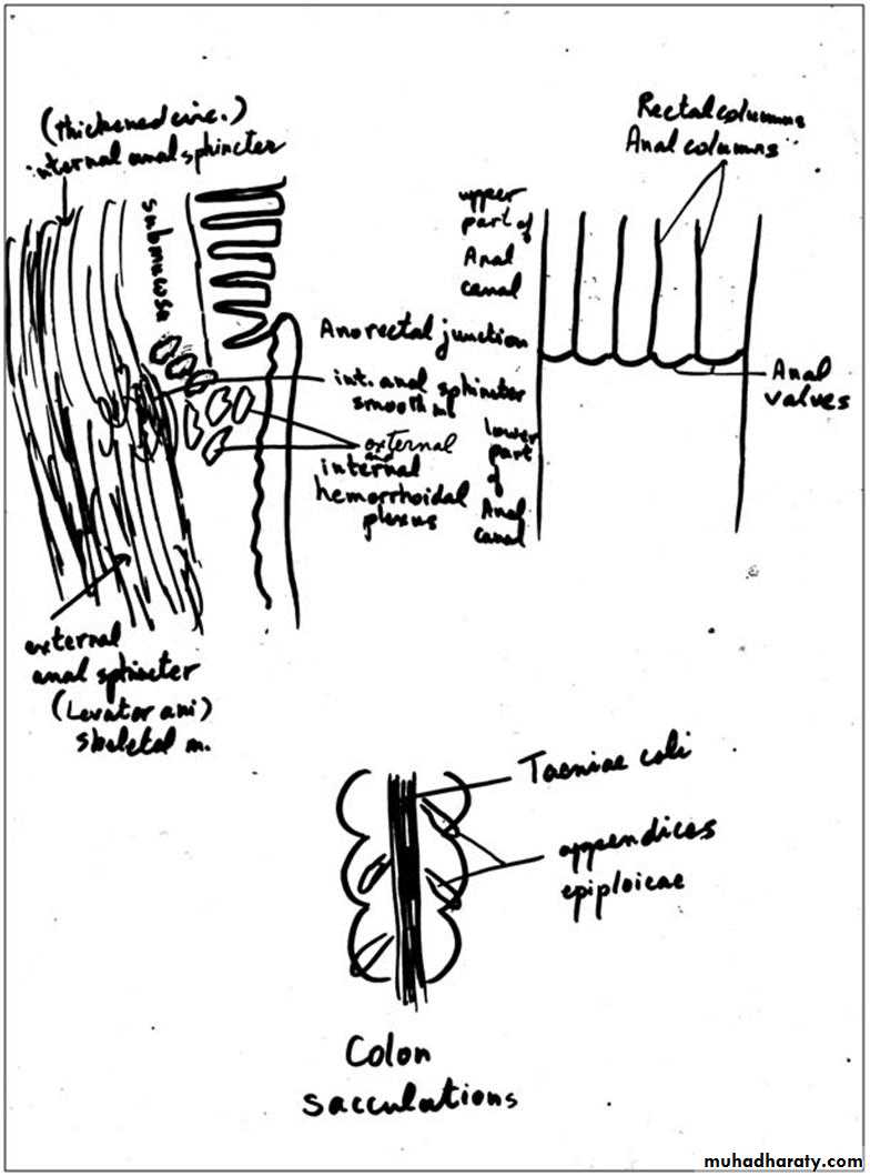 Rectum:- is usually divided into 2 parts. The upper part (rectum proper) measuring 5-7 inches in length, is structurally similar to colon. The intestinal glands are longer than in colon & are filled with goblet cells. There is no taeniae coli, the outer longitudinal muscle is complete layer (evenly distributed). The lower part is the upper part of the anal canal.