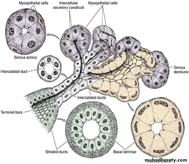 The major salivary glands are surrounded by capsule of c.t. rich in collagen fibers. The capsule is well developed in parotid, of average thickness in submandibular & very thin in sublingual. From the capsule septa (trabeculae) of c.t. penetrate the gland, dividing it into lobes & lobules. Vessels & nerves enter the gland at the hilum & gradually branches into the lobules. A rich vascular & nervous plexus surrounds the secretory & ductal components of each lobule. The alveoli (acini) are surrounded by basal lamina continuous with that of the ducts. Myoepithelial cells lie between the basal lamina & the epithelial cells of alveoli & also of the intercalated ducts. Myoepithelial cells surrounding the secretory portion are well developed & branched (called basket cells), whereas those associated with intercalated ducts are spindle –shaped & lie parallel to the length of the duct.