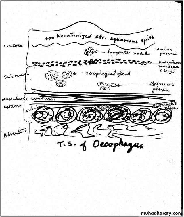 4. The adventitia:- consists of loose c.t. continuous with that of the surrounding structures. There is a serous layer only on the abdominal part of the oesophagus.
