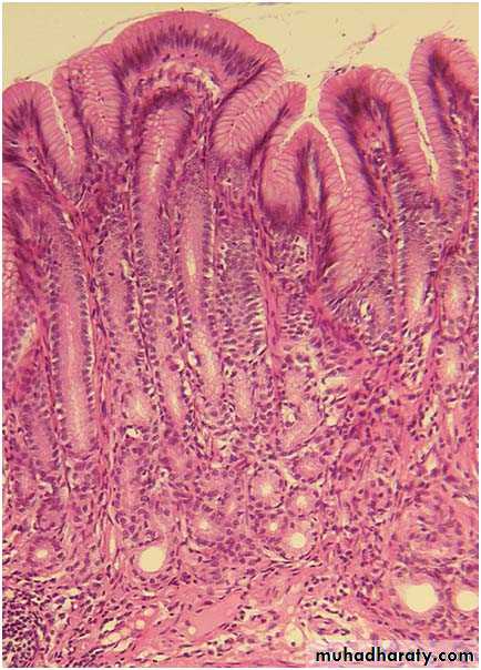 b) Lamina propria:- is similar to that of the small intestine. The intestinal glands are longer & more closely packed, containing many goblet cells, absorptive cells (have irregular short microvilli), stem cells (in the lower third of the gland) and also few enteroendocrine cells. They lack Paneth cells.