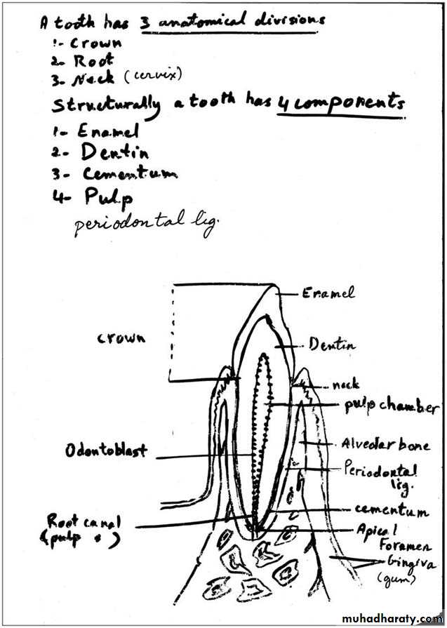 In adult human, the 32 permanent teeth are disposed in two bilaterally symmetric arches in the maxillary & mandibular bones. There are 8 teeth in each quadrant: 2 incisors, 1 canine, 2 premolars & 3 permanent molars. Twenty of the permanent teeth are preceded by deciduous (baby) teeth. The permanent molars have no deciduous precursors.A tooth has 3 anatomical divisions:-