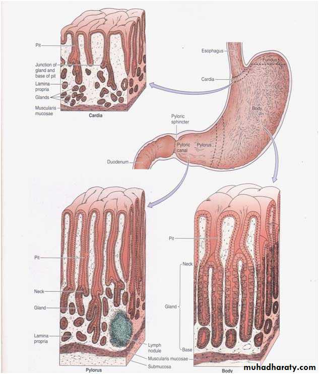 1) The cardiac glands:- are present in the cardiac region. They are simple or branched tubular glands, lined by mucus secreting columnar cells similar to the mucous neck cells of the gastric gland proper. They secrete mucus & lysozyme.2) Fundic glands (gastric gland proper):- are present in the lamina propria of the fundus & body of the stomach. They are branched, tubular glands, 3 to 7 of which open into the bottom of each gastric pit. The glands are composed of the following cells:-