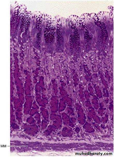 A) Surface epithelium (simple columnar epithelium):- their cells secrete mucin (mucus) & they are known as surface mucous cells. The mucus forms a thick layer that protects these cells from the effects of the strong acid secreted by the stomach. The surface epithelium invaginates to various extents into the lamina propria, forming gastric pits (lined by the same epithelium). Emptying into the gastric pits are branched tubular glands (cardiac, fundic & pyloric) characteristic of each region of the stomach. The surface mucous cells are thought to produce blood group substances. Tight junctions present around surface & pits cells also form part of the barrier to acid. Stress & other psychosomatic factor; ingested substances such as aspirin or ethanol & some microorganisms (e.g. Helicobacter pylori) can disrupt this epithelial layer & lead to ulceration.B) The lamina propria:- is occupied by the gastric glands. These are branched tubular glands, separated by little amount of c.t. They open into the bases of the gastric pits.