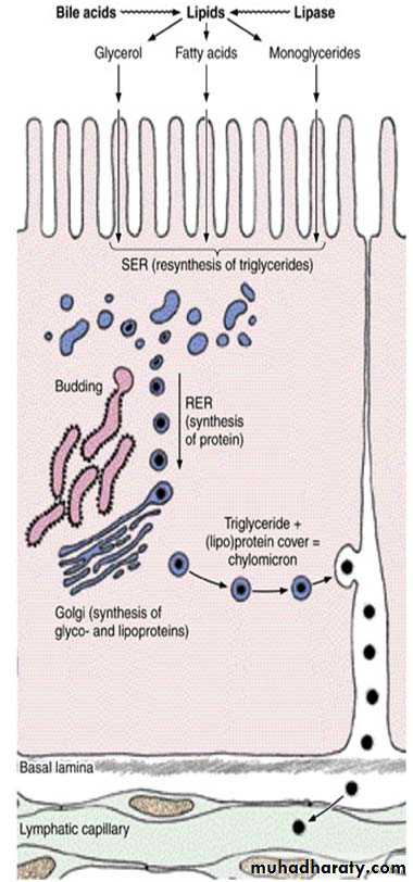 a) The intestinal absorptive cells (enterocytes):- are tall columnar cells, each with an oval nucleus in the basal half of the cell & striated(brush border) at the apex of each cell. When viewed with E.M., the striated border is seen to be a layer of densely packed microvilli. Each absorptive cell is estimated to have an average 3000 microvilli. Microvilli have the important physiologic function of increasing the area of contact between the intestinal surface & the nutrients. The function of the enterocytes is to absorb the nutrient molecules produced by the digestive process. Disaccharidases & peptidases secreted by absorptive cells & bound to microvilli in the brush border; hydrolyze the disaccharides & dipeptides into monosaccharides & amino acids that are easily absorbed. Lipid digestion occurs mainly as a result of the action of pancreatic lipase and bile. In humans, most of the lipid absorption takes place in the duodenum and upper jejunum.