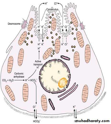 Diagram of a parietal cell, showing the main steps in the synthesis of hydrochloric acid. Active transport by ATPase is indicated by arrows and diffusion is indicated by dotted arrows. Under the action of carbonic anhydrase, blood CO2 produces carbonic acid. Carbonic acid dissociates into a bicarbonate ion and a proton H+, which is pumped into the stomach lumen in exchange for K+. A high concentration of intracellular K+ is maintained by the Na+,K+ ATPase, while HCO3— is exchanged for Cl— by an antiport. The tubulovesicles of the cell apex are seen to be related to hydrochloric acid secretion, because their number decreases after parietal cell stimulation. The bicarbonate ion returns to the blood and is responsible for a measurable increase in blood pH during digestion.