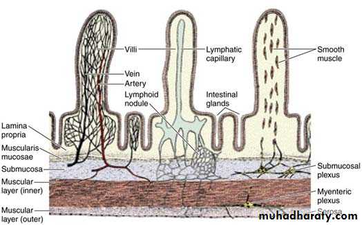 The lamina propria of the small intestine:- is composed of loose c.t. with blood & lymph vessels, nerve fibers & smooth m cells. The lamina propria constitutes the core of the intestinal villi & fills all the spaces between the glands. The smooth m. cells are responsible for rhythmic movements of the villi, which are important for absorption.