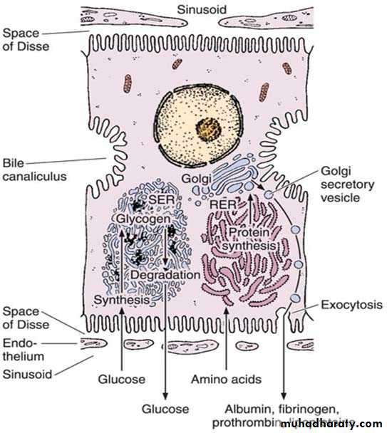 Hepatocytes usually contain one round, central nucleus; some are binucleated (25%). Occasionally nuclei are polyploid (more than one set of chromosomes). The cytoplasm of the hepatocytes is typically fairly acidophilic (many mitochondria and some SER), with areas of basophilia (rough endoplasmic reticulum). The hepatocytes are unusual in that they possess abundant RER and SER in the same cells. The RER is associated with protein synthesis such as: albumin, fibrinogen, globulin, prothrombin. The SER is associated with steroid metabolism and also is responsible for the processes of oxidation, methylation, and conjugation required for inactivation or detoxification of various substances before their excretion from the body.