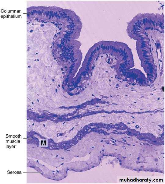 Mucosa: is composed of a simple columnar epithelium and a richly vascularized lamina propria. The mucous membrane is thrown into folds that are particularly evident in the empty bladder. There is no gland in the gallbladder except in the neck region.