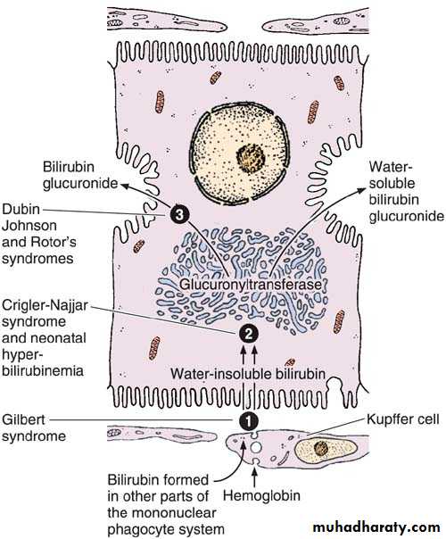 The secretion of bilirubin. The water-insoluble form of bilirubin is derived from the metabolism of hemoglobin in macrophages. Glucuronyltransferase activity in the hepatocytes causes bilirubin to be conjugated with glucuronide in the smooth endoplasmic reticulum, forming a water-soluble compound. When bile secretion is blocked, the yellow bilirubin or bilirubin glucuronide is not excreted; it accumulates in the blood, and jaundice results. Several defective processes in the hepatocytes can cause diseases that produce jaundice: a defect in the capacity of the cell to trap and absorb bilirubin (1), the inability of the cell to conjugate bilirubin because of a deficiency in glucuronyltransferase (2), or problems in the transfer and excretion of bilirubin glucuronide into the bile canaliculi (3). One of the most frequent causes of jaundice, however–unrelated to hepatocyte activity–is the obstruction of bile flow as a result of gallstones or tumors of the pancreas.