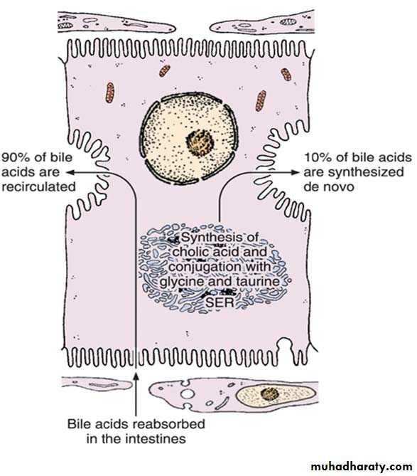 Mechanism of secretion of bile acids. About 90% of bile acids are derived from the intestinal epithelium and transported to the liver. The remaining 10% are synthesized in the liver by the conjugation of cholic acid with the amino acids glycine and taurine. This process occurs in the smooth endoplasmic reticulum (SER).