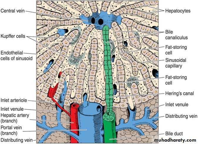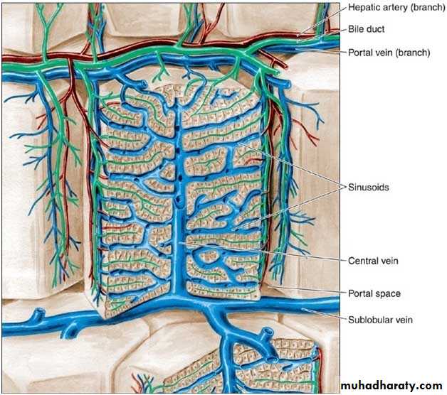 Hepatic sinusoids: are vessels that arise at the periphery of a lobule and run between adjacent plates of hepatocytes. They receive blood from the vessels in the portal areas and deliver it to the central vein. Sinusoids are larger than capillaries, more irregular in shape and their lining cells are directly related to the epithelial cells with no intervening c.t. The lining of the sinusoids consists of a discontinuous layer of fenestrated endothelium also contain Kupffer cells in their endothelial lining. They lack basal lamina.