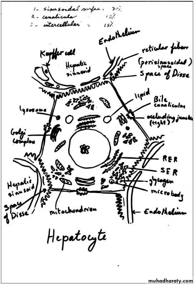 Sinusoidal surfaces: are separated from the sinusoidal vessel by the space of Disse. They account for approximately 70% of the total hepatocyte surface. They are covered by short microvilli, which protrude into the space of Disse. The sinusoidal surface is the site where material is transferred between the sinusoids and the hepatocyte.