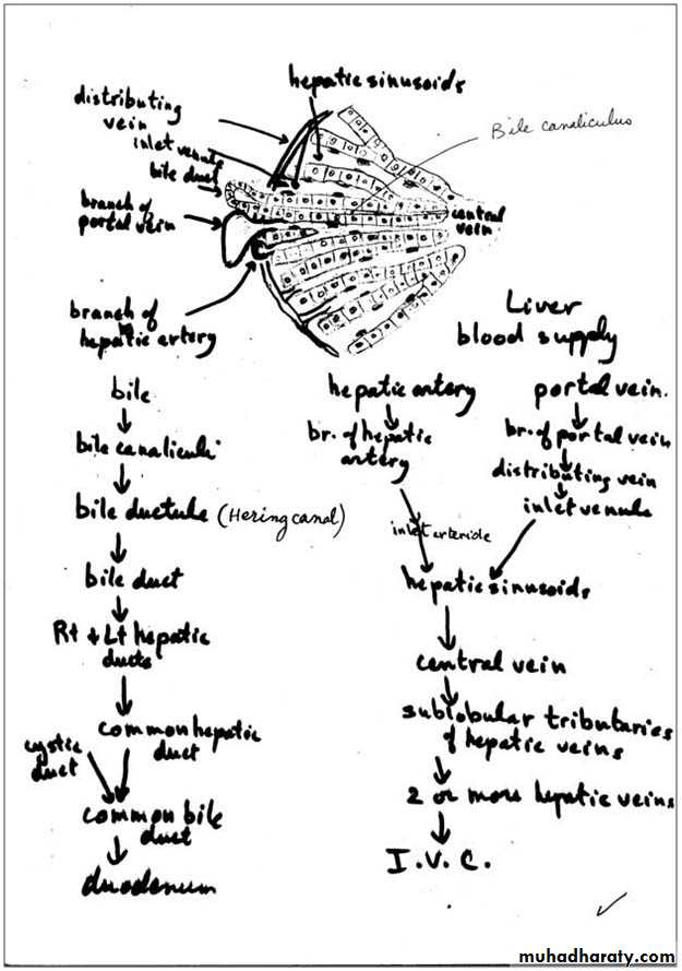 The arterial and venous blood flows centripetally in each lobule (from the portal areas to drain in the central vein), whereas the bile flows centrifugally towards the portal areas.