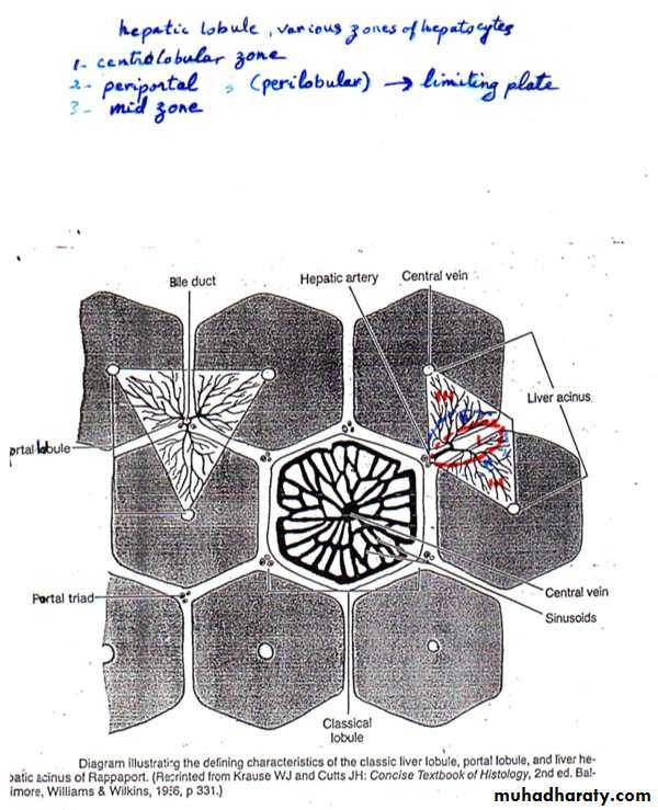 3. Hepatic Acinus (of Rappaport): (it is based on changes in oxygen, nutrient, and toxin content as blood flowing through the sinusoids is acted on by hepatocytes)