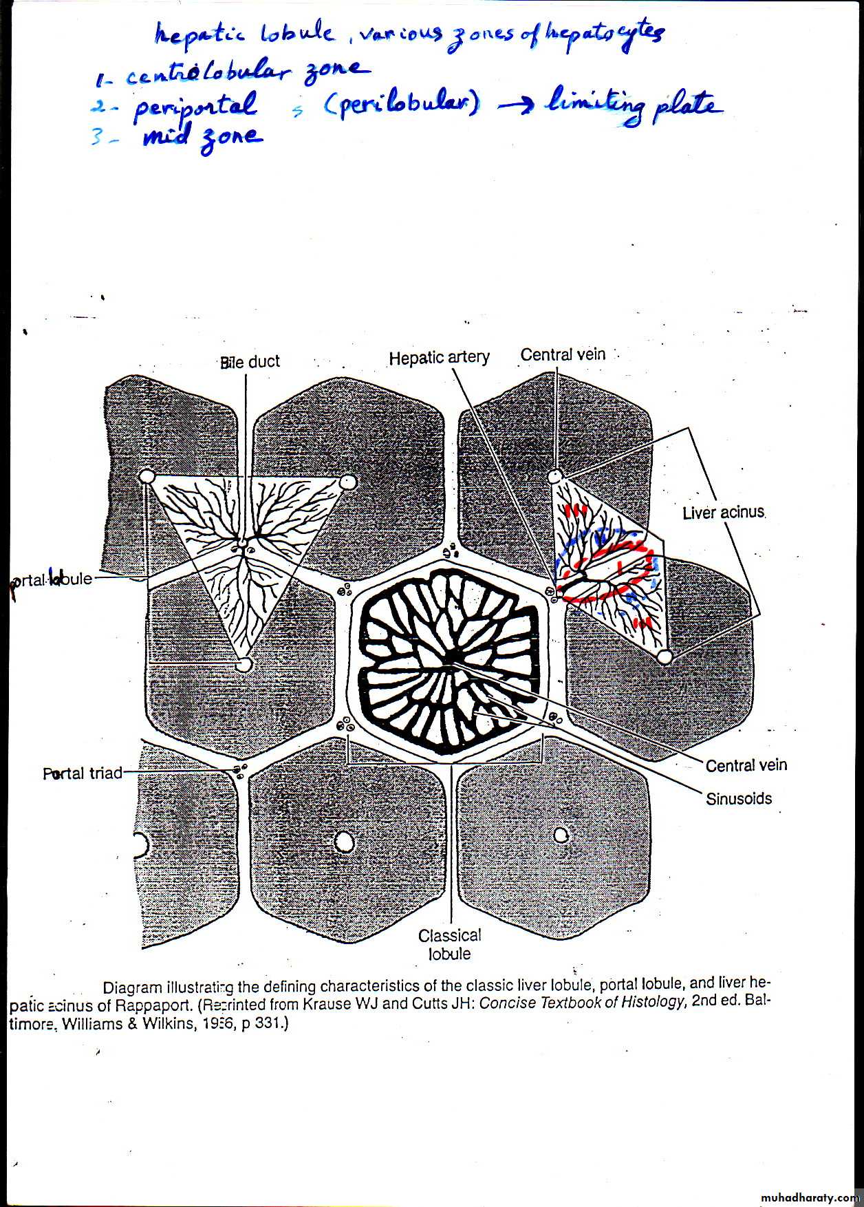 • Schematic drawing of the structure of the liver. The liver lobule in the center is surrounded by the portal space (dilated here for clarity). Arteries, veins, and bile ducts occupy the portal spaces. Nerves, connective tissue, and lymphatic vessels are also present but are (again, for clarity) not shown in this illustration. In the lobule, note the radial disposition of the plates formed by hepatocytes; the sinusoidal capillaries separate the plates. The bile canaliculi can be seen between the hepatocytes. The sublobular (intercalated) veins drain blood from the lobules. (Redrawn and reproduced, with permission, from Bourne G: An Introduction to Functional Histology. Churchill, 1953.