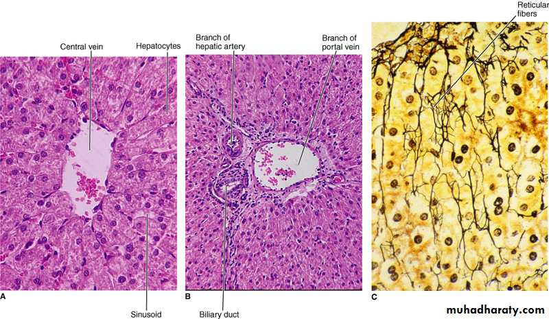 Photomicrograph of the liver. A: A central (centrolobular) vein. Note the liver plates that anastomose freely, limiting the space occupied by the sinusoids. H&E stain. Medium magnification. (Courtesy of MF Santos.)