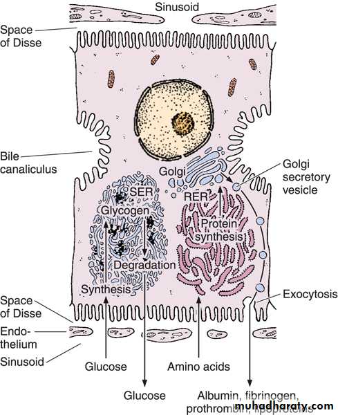 • Protein synthesis and carbohydrate storage in the liver. Carbohydrate is stored as glycogen, usually associated with the smooth endoplasmic reticulum (SER). When glucose is needed, glycogen is degraded. In several diseases, glycogen degradation is depressed, resulting in abnormal intracellular accumulations of glycogen. Proteins produced by hepatocytes are synthesized in the rough endoplasmic reticulum (RER), which explains why hepatocyte lesions or starvation lead to a decrease in the amounts of albumin, fibrinogen, and prothrombin in a patient’s blood. The impairment of protein synthesis leads to several complications, since most of these proteins are carriers, important for the blood’s osmotic pressure and for coagulation.