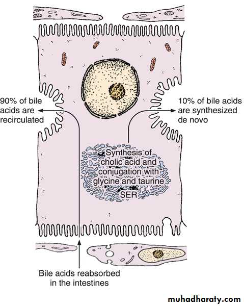 • Mechanism of secretion of bile acids. About 90% of bile acids are derived from the intestinal epithelium and transported to the liver. The remaining 10% are synthesized in the liver by the conjugation of cholic acid with the amino acids glycine and taurine. This process occurs in the smooth endoplasmic reticulum (SER).
