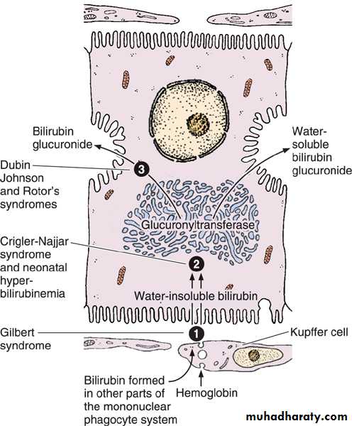• The secretion of bilirubin. The water-insoluble form of bilirubin is derived from the metabolism of hemoglobin in macrophages. Glucuronyltransferase activity in the hepatocytes causes bilirubin to be conjugated with glucuronide in the smooth endoplasmic reticulum, forming a water-soluble compound. When bile secretion is blocked, the yellow bilirubin or bilirubin glucuronide is not excreted; it accumulates in the blood, and jaundice results. Several defective processes in the hepatocytes can cause diseases that produce jaundice: a defect in the capacity of the cell to trap and absorb bilirubin (1), the inability of the cell to conjugate bilirubin because of a deficiency in glucuronyltransferase (2), or problems in the transfer and excretion of bilirubin glucuronide into the bile canaliculi (3). One of the most frequent causes of jaundice, however–unrelated to hepatocyte activity–is the obstruction of bile flow as a result of gallstones or tumors of the pancreas.