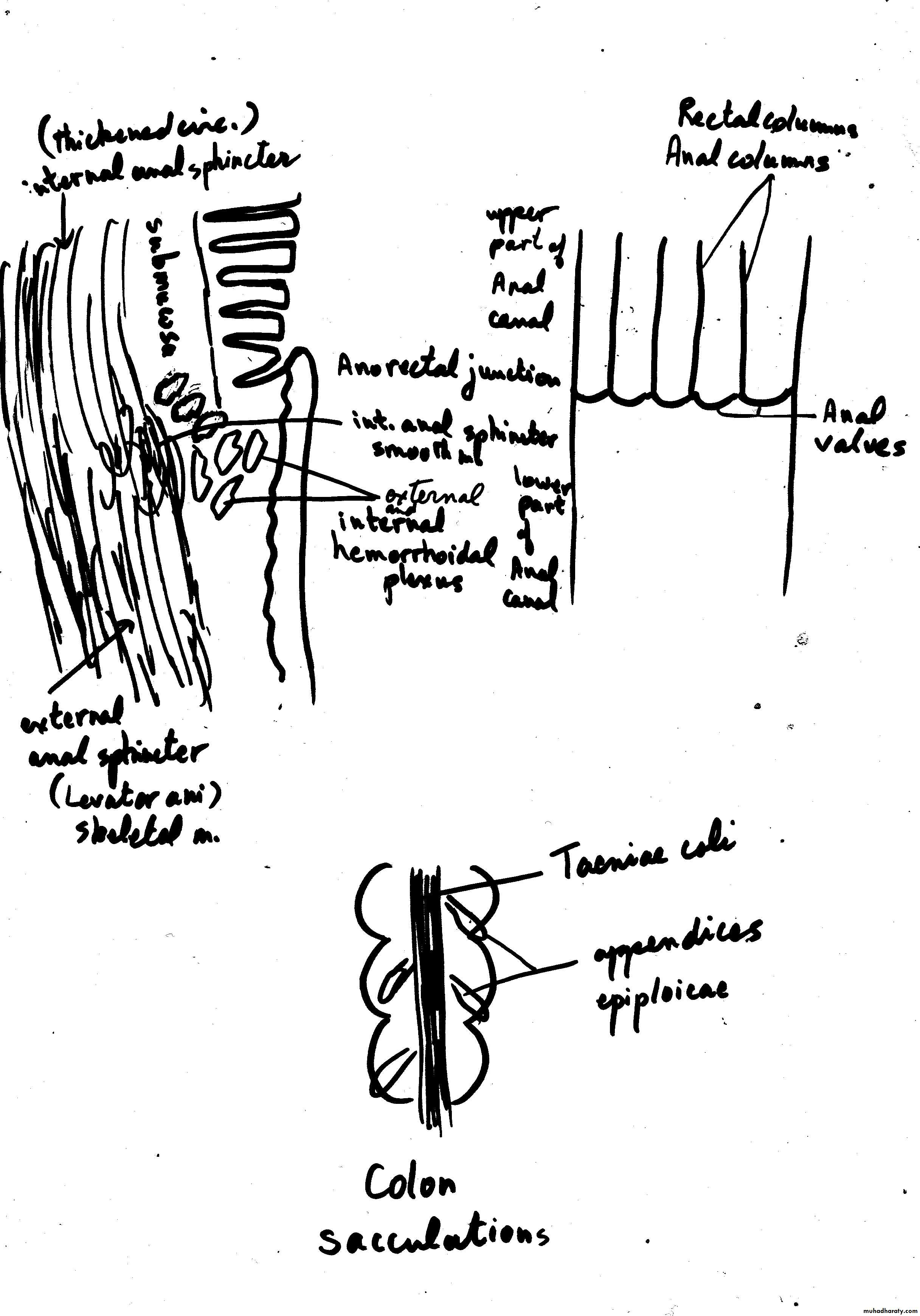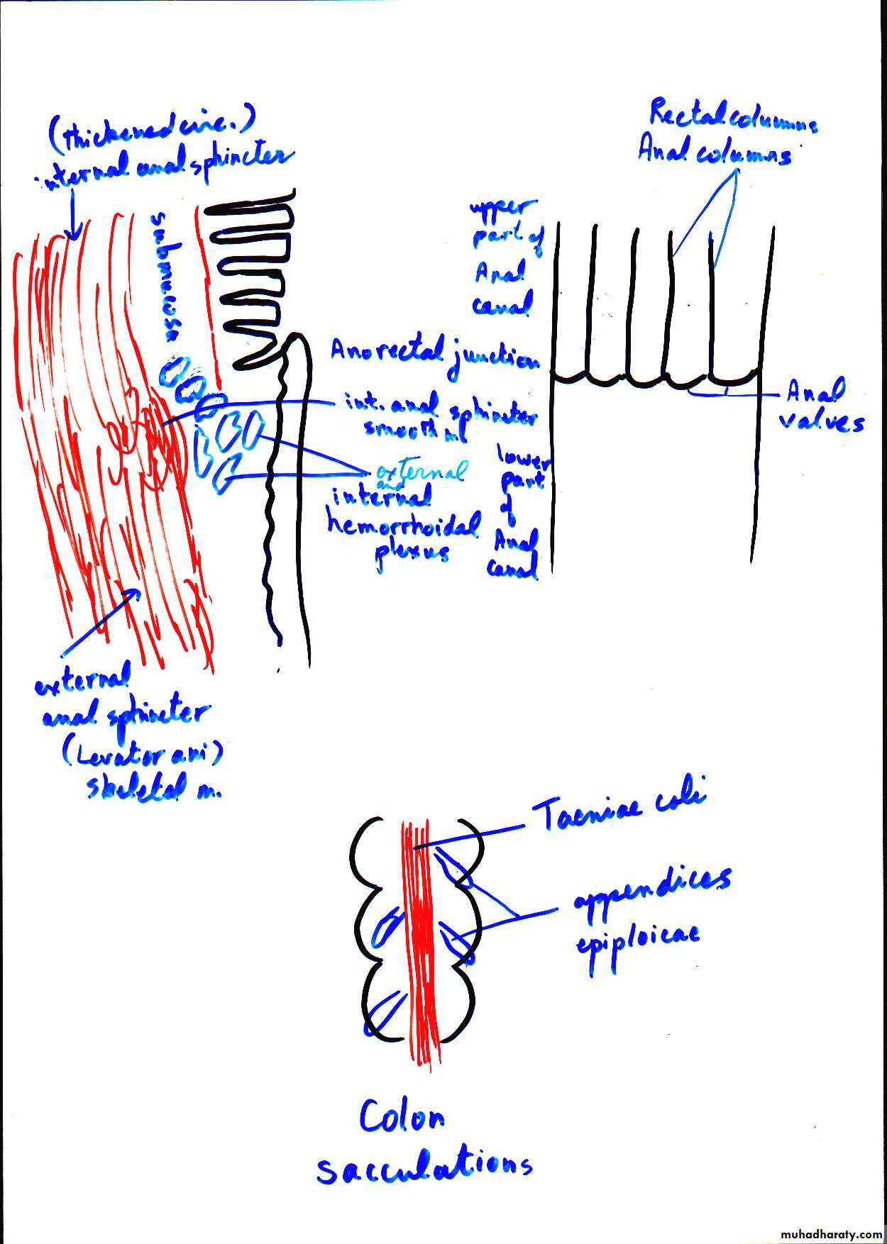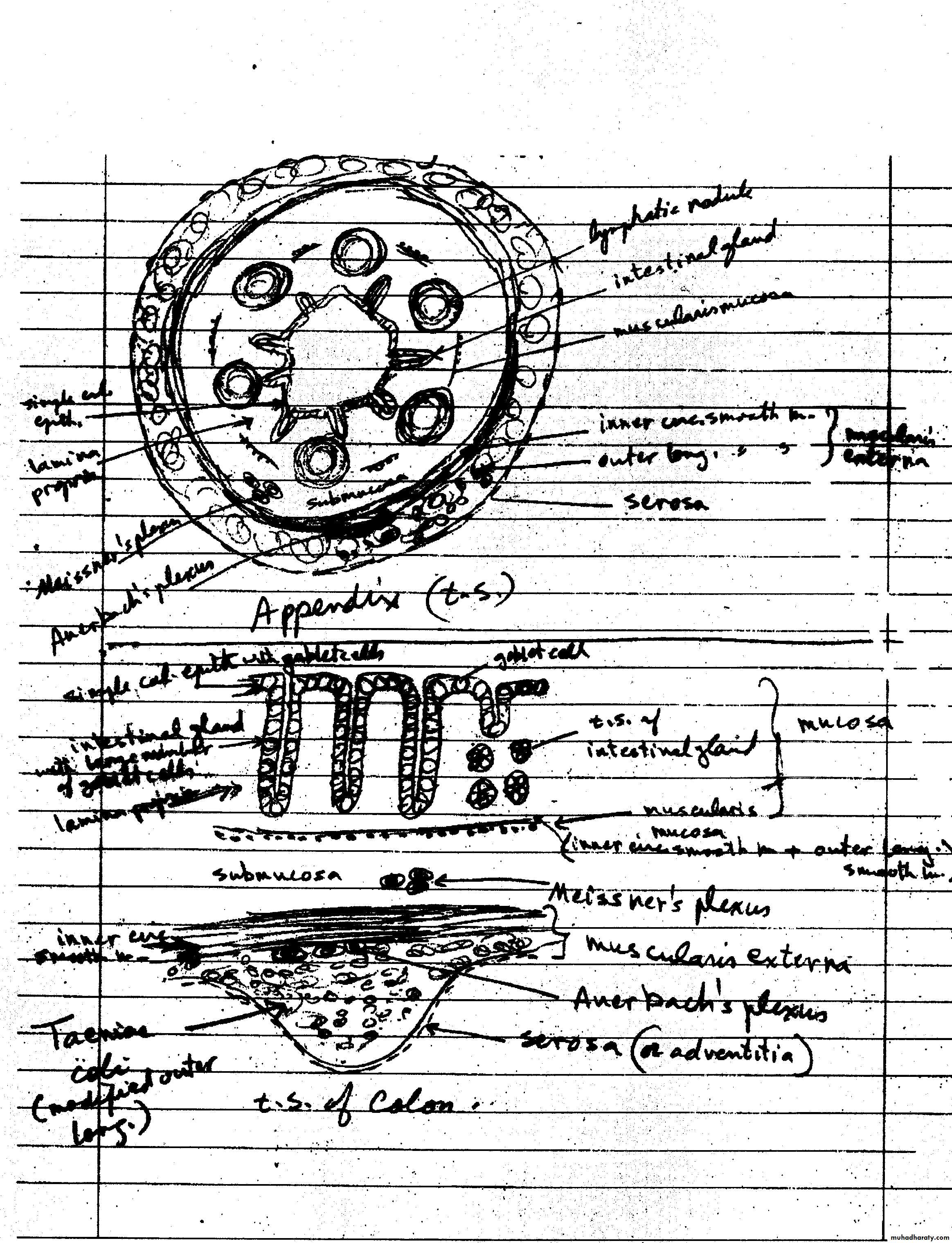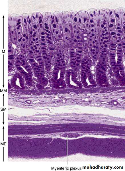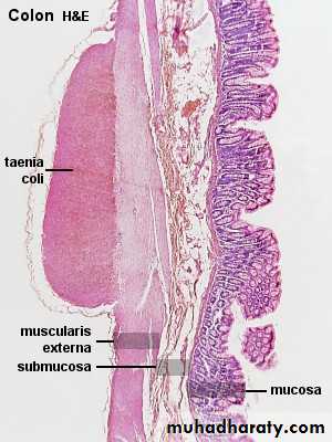 • Photomicrograph of a section of large intestine with its various layers. Note the absence of villi. M, mucosa; MM, muscularis mucosae; SM, submucosa; ME, muscularis externa. PT stain. Low magnification.