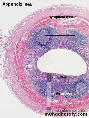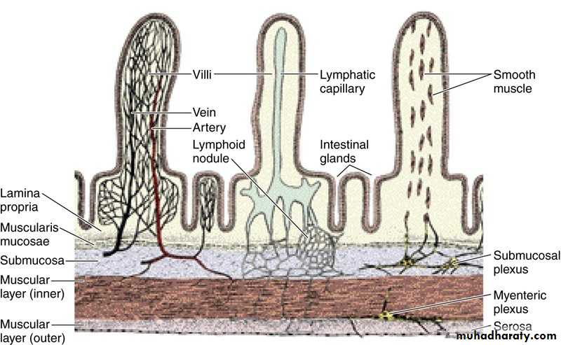 • Blood circulation (left), lymphatic circulation (center), and innervation (right) of the small intestine. The smooth muscle system for contracting the villi is illustrated in the villus on the right.