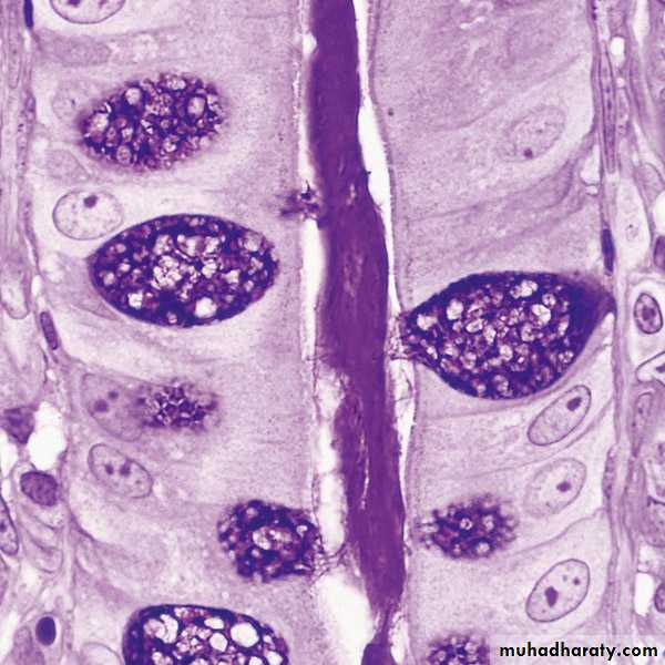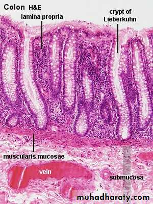 • Section of a large intestinal gland showing its absorptive and mucous goblet cells. Observe that the goblet cells are secreting and beginning to fill the lumen of the gland with its secretions. The microvilli in the absorptive cells participate in the process of water absorption. PT stain. High magnification.