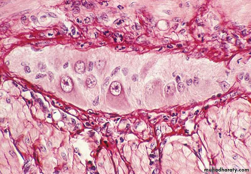 • Photomicrograph of a group of neurons (with large nuclei) and satellite cells (with small nuclei) constituting a component of the myenteric plexus between 2 smooth muscle layers. Note the red stained collagen fibers. Picrosirius-hematoxylin. Medium magnification.