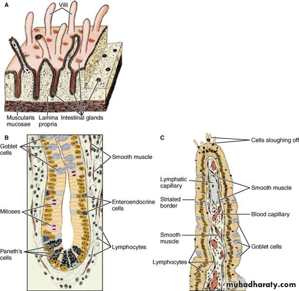 3. Microvilli of intestinal absorptive cells• Schematic diagrams illustrating the structure of the small intestine. A: The small intestine under low magnification. In the villus to the left, note the desquamation of epithelial cells. Because of constant mitotic activity of the cells from the closed end of the glands and the upward migration of these cells (dashed arrows), the intestinal epithelium is continuously renewed. Note the intestinal glands of Lieberkühn. B: The intestinal glands have a lining of intestinal epithelium and goblet cells (upper portion). At the lower level, the immature epithelial cells are frequently seen in mitosis; note also the presence of Paneth’s and enteroendocrine cells. As the immature cells progress upward, they differentiate and develop microvilli, seen as a brush border in the electron microscope. Cell proliferation and cell differentiation occur simultaneously in the closed end of these glands. C: A villus tip showing the columnar covering epithelium with its striated border and a moderate number of goblet cells. Blood capillaries, a lymphatic capillary, smooth muscle cells, and lymphocytes can be seen in the connective tissue core of the villus. Great numbers of lymphocytes are in the epithelial layer. Cells are sloughing off at the apex of the villus. (Redrawn and reproduced, with permission, from Ham AW: Histology, 6th ed. Lippincott, 1969.)