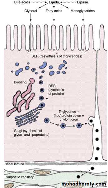 Lipid absorption in the small intestine. Lipase promotes the hydrolysis of lipids to monoglycerides and fatty acids in the intestinal lumen. These compounds are stabilized in an emulsion by the action of bile acids. The products of hydrolysis cross the microvilli membranes passively and are collected in the cisternae of the smooth endoplasmic reticulum (SER), where they are resynthesized to triglycerides. These triglycerides are surrounded by a thin layer of proteins that form particles called chylomicrons (0.2—1 micrometers in diameter). Chylomicrons are transferred to the Golgi complex and then migrate to the lateral membrane, cross it by a process of membrane fusion (exocytosis), and flow into the extracellular space in the direction of the blood and lymphatic vessels. Most chylomicrons go to the lymph; a few go to the blood vessels. The long-chain lipids (>C12) go mainly to the lymphatic vessels. Fatty acids of fewer than 10—12 carbon atoms are not reesterified to triglycerides but leave the cell directly and enter the blood vessels. RER, rough endoplasmic reticulum. (Based on results of Friedman HI, Cardell RR Jr: Anat Rec 1977;188:77.)