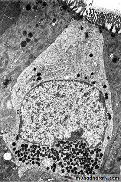 • Electron micrograph of an enteroendocrine cell (open type) of the human duodenum. Note the microvilli in its apex. X6900. (Courtesy of AGE Pearse.)