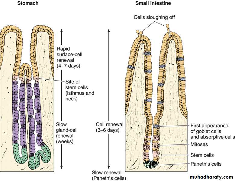 • Regeneration of the epithelial lining of the stomach and small intestine. Note differences in the location of stem cells.