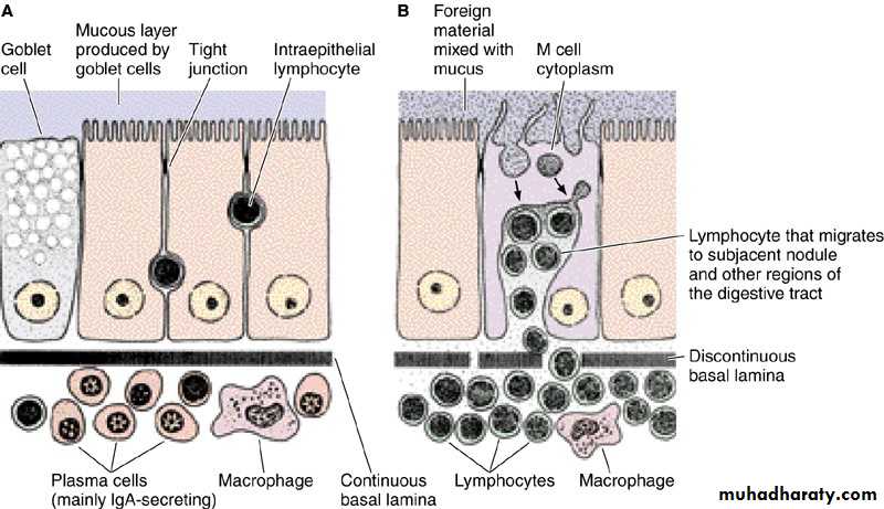 • Some aspects of immunologic protection of the intestine. A: A condition that is more frequent in the upper tract, such as in the jejunum. There are many IgA-secreting plasma cells, scattered lymphocytes, and some macrophages. Note that the lymphocytes in the epithelial lining are located outside the epithelial cells, and below the tight junctions. B: A condition that is more frequent in the ileum, where aggregates of lymphocytes are located under M cells. The M cells transfer foreign material (microorganisms and macromolecules) to lymphocytes located deep in the cavities of the M cells. Lymphocytes spread the information received from this foreign material to other regions of the digestive tract, and probably to other organs, through blood and lymph.