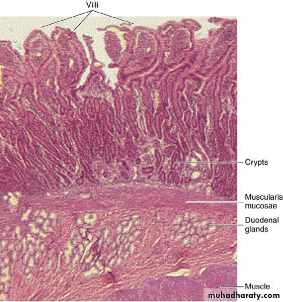 • Photomicrograph of the duodenum, showing villi and duodenal glands in the submucosa. H&E stain. Low magnification.