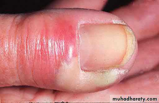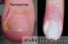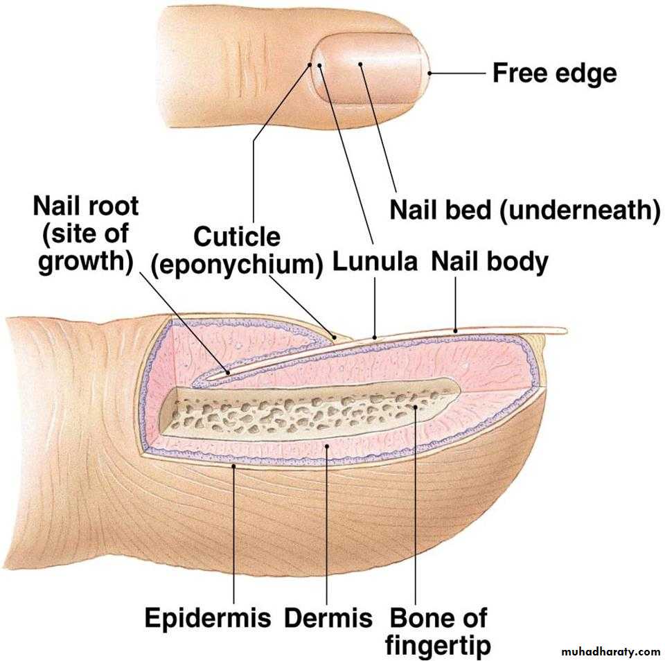 hard, flexible plates of keratin on the dorsal surface of each distal phalanx.The proximal part of the nail is the nail root and is covered by the proximal skin fold which is thin and lacks both hair and glands. The epidermal stratum corneum extending from the proximal nail fold forms the cuticle, or eponychium.