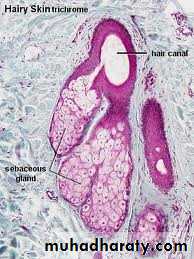 Sebaceous glands are branched acinar glands with several acini converging at a short duct which usually empties into the upper portion of a hair follicle.