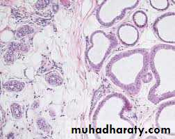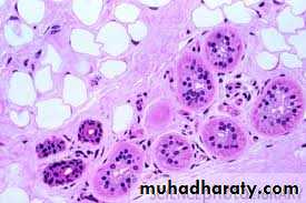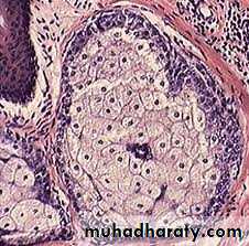 The acini consist of a basal layer of undifferentiated flattened epithelial cells on the basal lamina. These cells proliferate and are displaced toward the middle of the acinus, undergoing terminal differentiation as distinctly large, lipid-producing sebocytes.