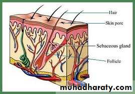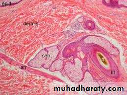 Sebaceous glands are embedded in the dermis over most of the body surface, except the thick skin of the palms and soles.