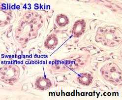 Sweat glands are epithelial derivatives embedded in the dermis.