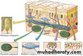 (1) Tactile corpuscles (Meissner corpuscles) are elliptical structures, in the fingertips, palms and soles. They detect light touch.(2)Lamellated (Pacinian) corpuscles are large oval structures, found deep in the reticular dermis or hypodermis, with an outer capsule and 15 to 50 thin, concentric lamellae of flat Schwann-type cells and collagen surrounding a highly branched, unmyelinated axon. They are specialized for sensing coarse touch, pressure (sustained touch), and vibrations.