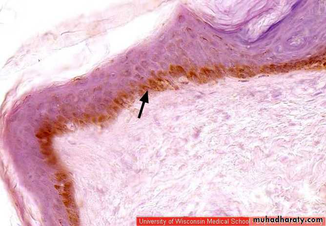 (6)All keratinocytes in the stratum basale contain intermediate filaments composed of keratins.