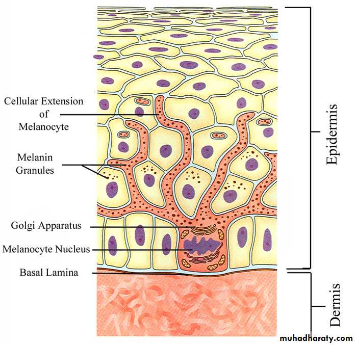 (4)They have rounded cell bodies and long irregular dendritic extensions from each melanocyte branch into the epidermis, running between the cells of the basal and spinous layers.